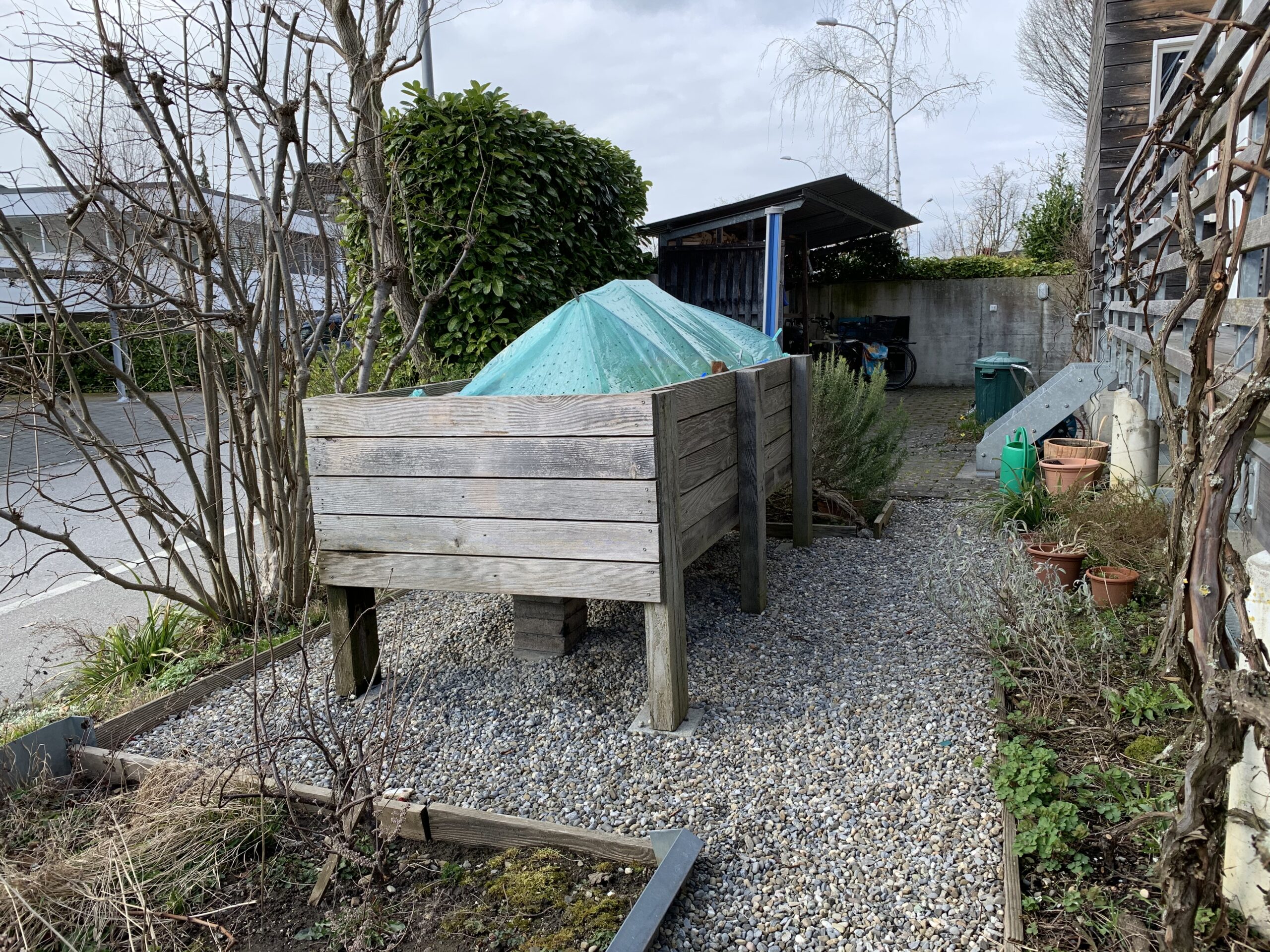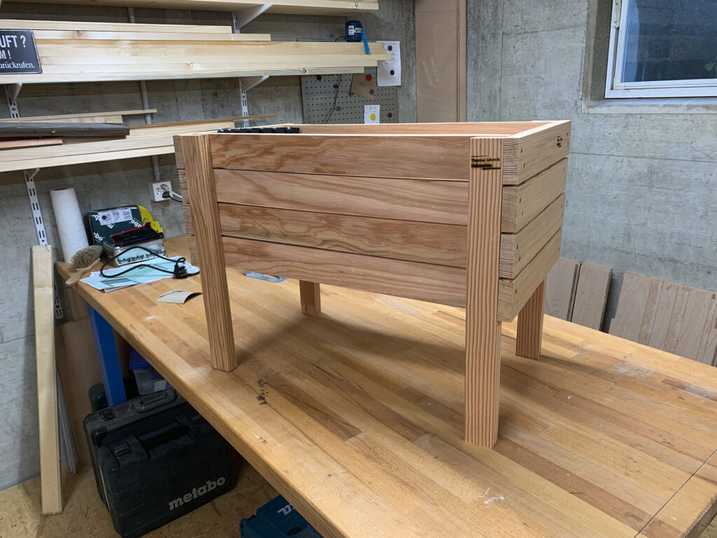 Die Konstruktion war einmalig. Die Beine/Pfosten stehen unter dem Kasten des Hochbeets. Mir war das ein wenig unsicher, deshalb habe ich nacher meine Standard-Konstruktion auf Beine/Pfosten festgelegt, die mit dem oberen Rand des Kastens abschliessen und damit auch für mehr Stabilität des gesamten Hochbeets sorgen.