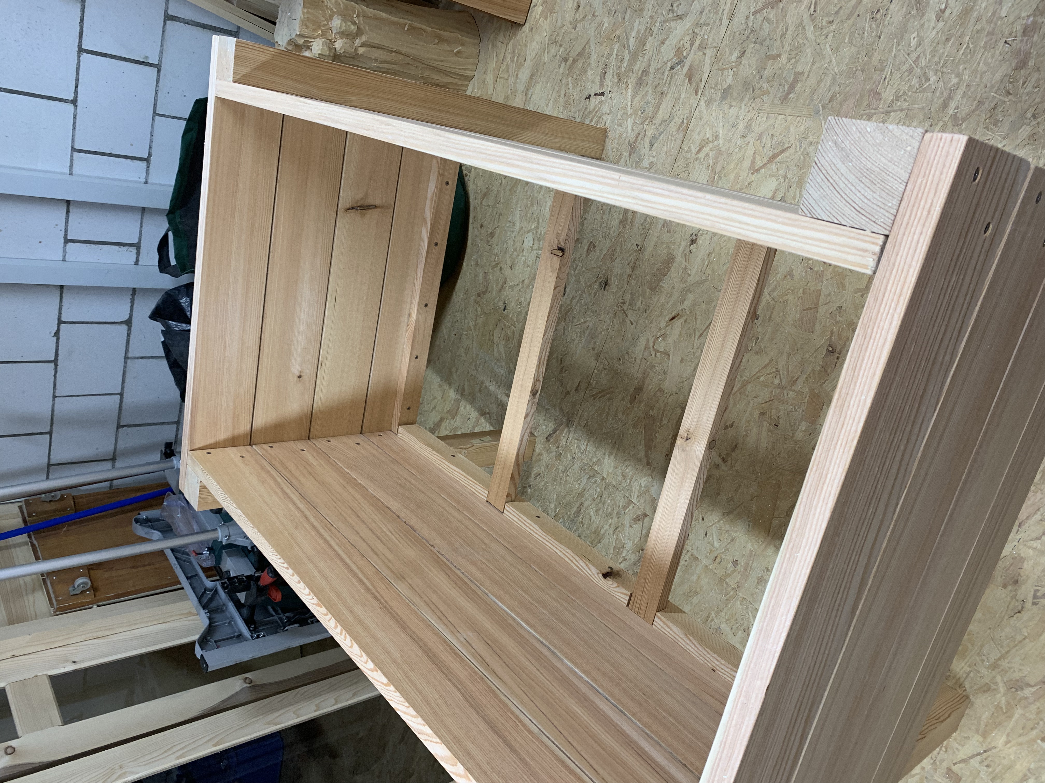 Aus unserer alten Terasse gefertigt, mit links 2 Tablarbrettern.