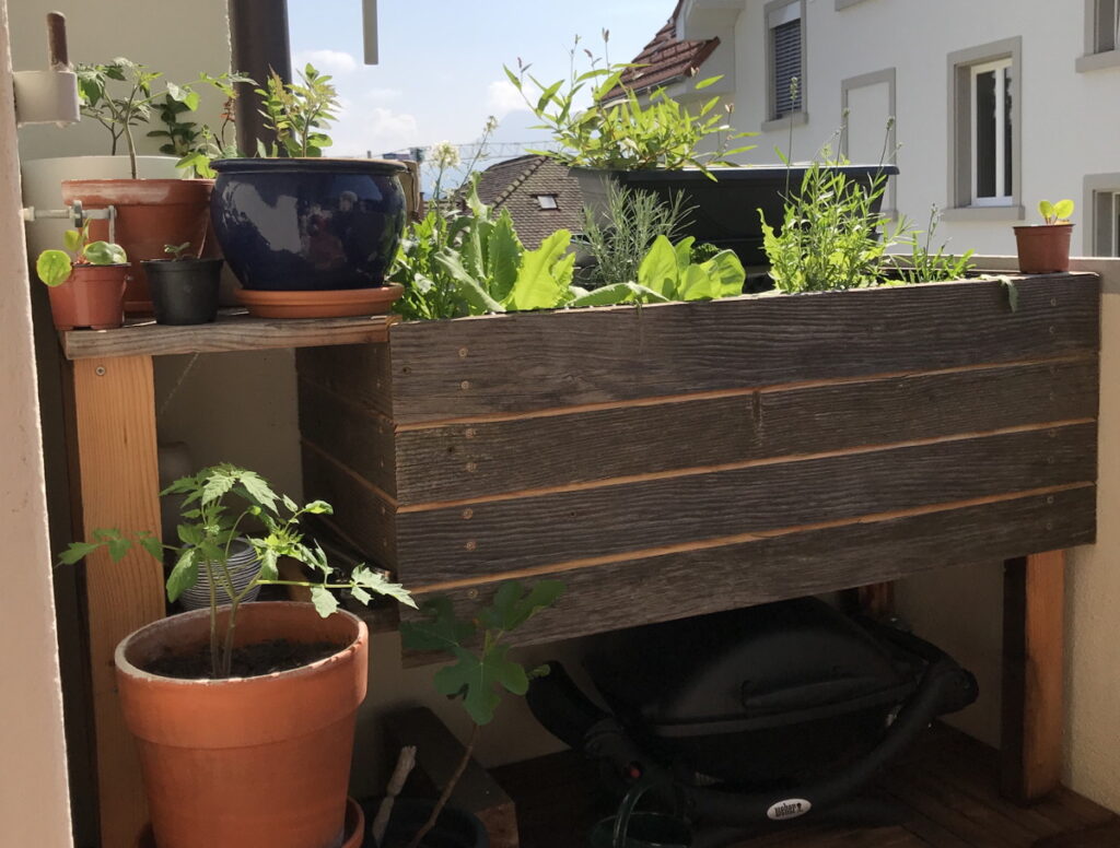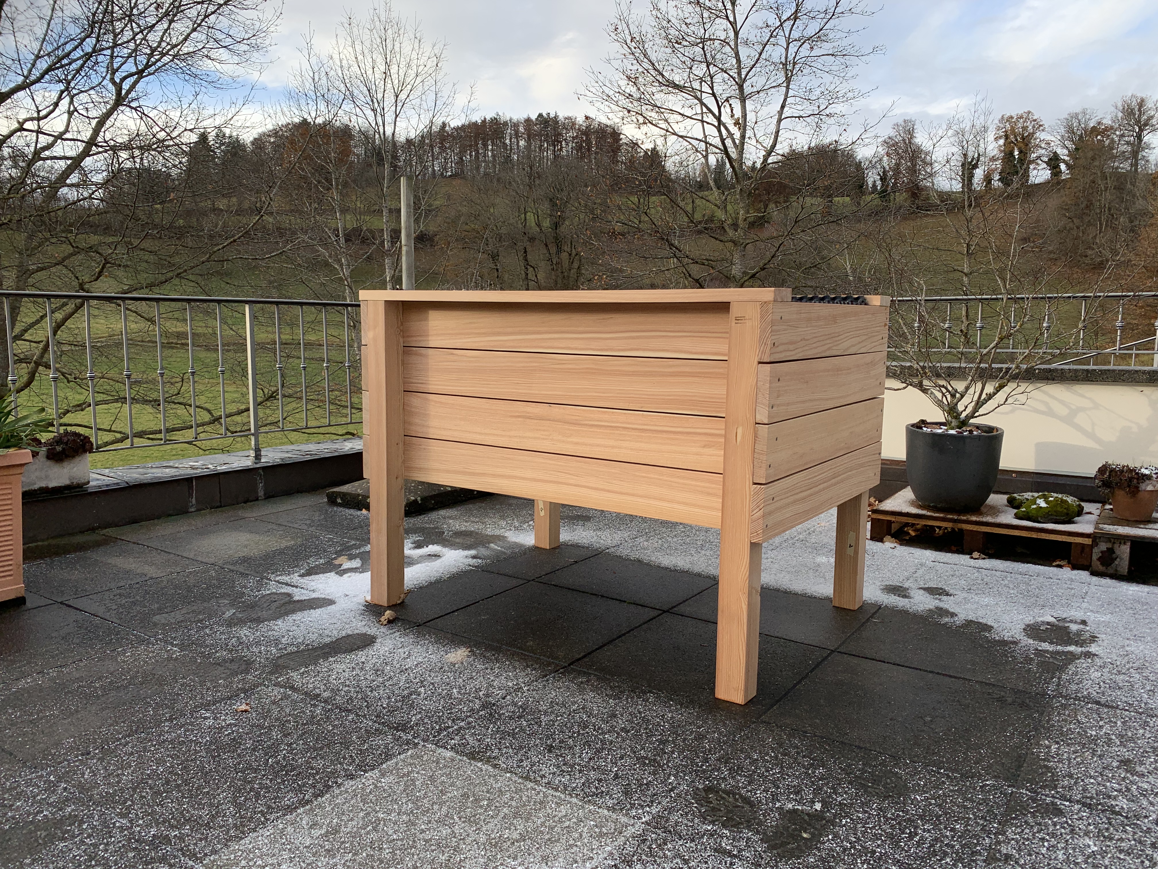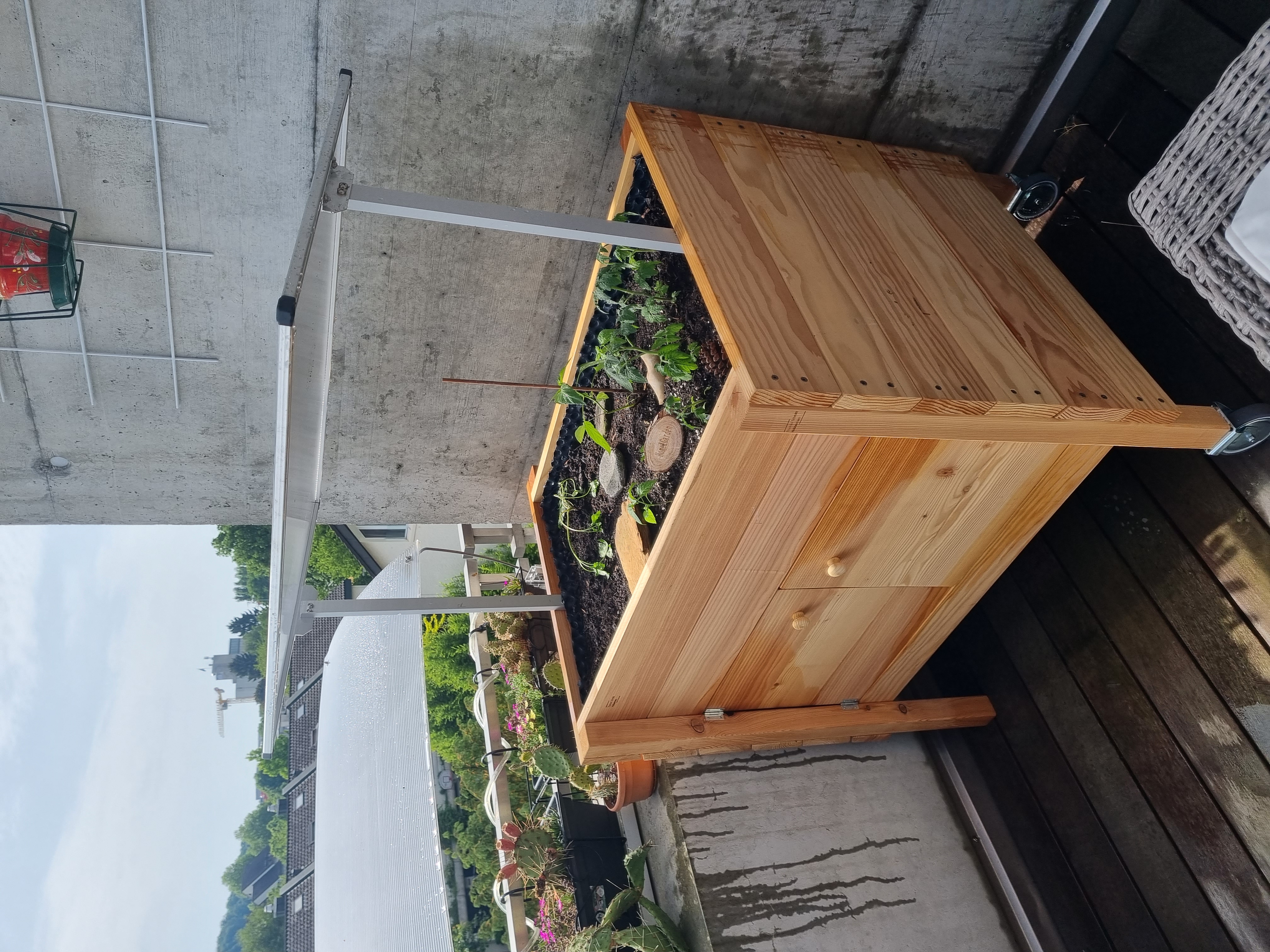Das Hochbeet steht auf der Terrasse einer Attikawohnung, im offenen Bereich.