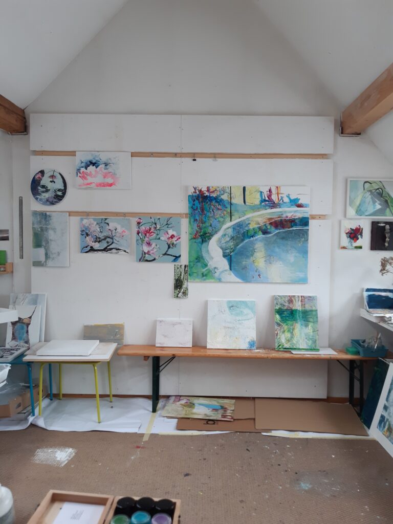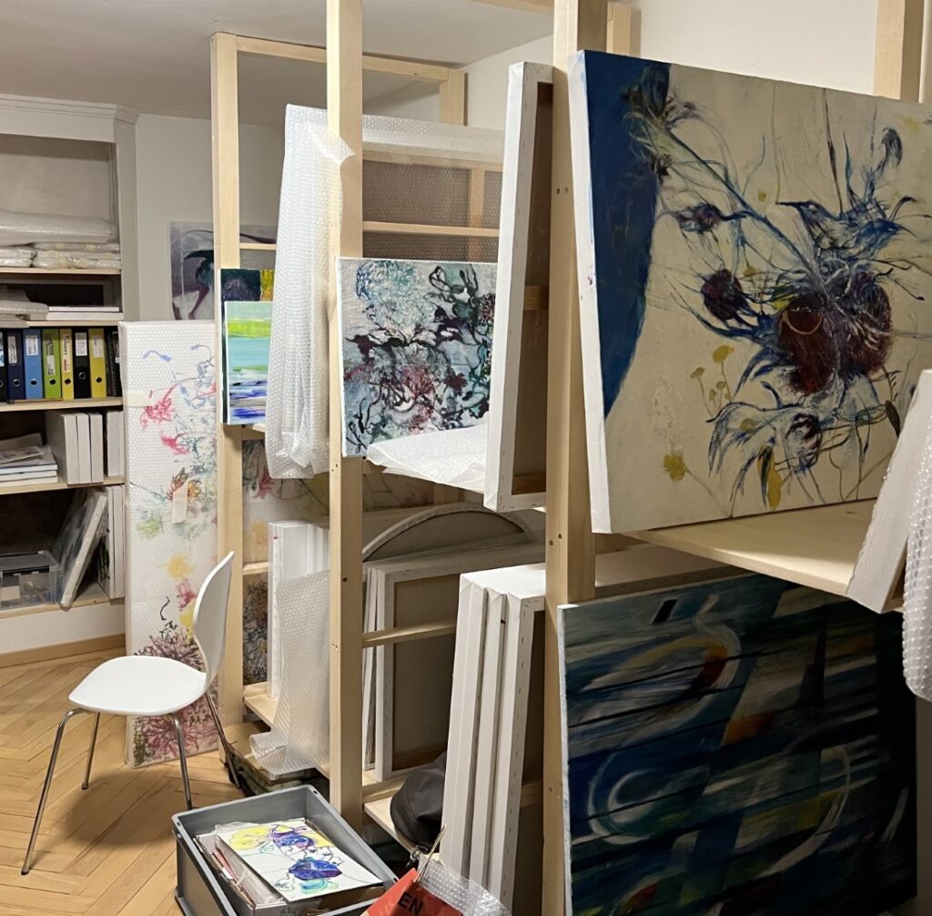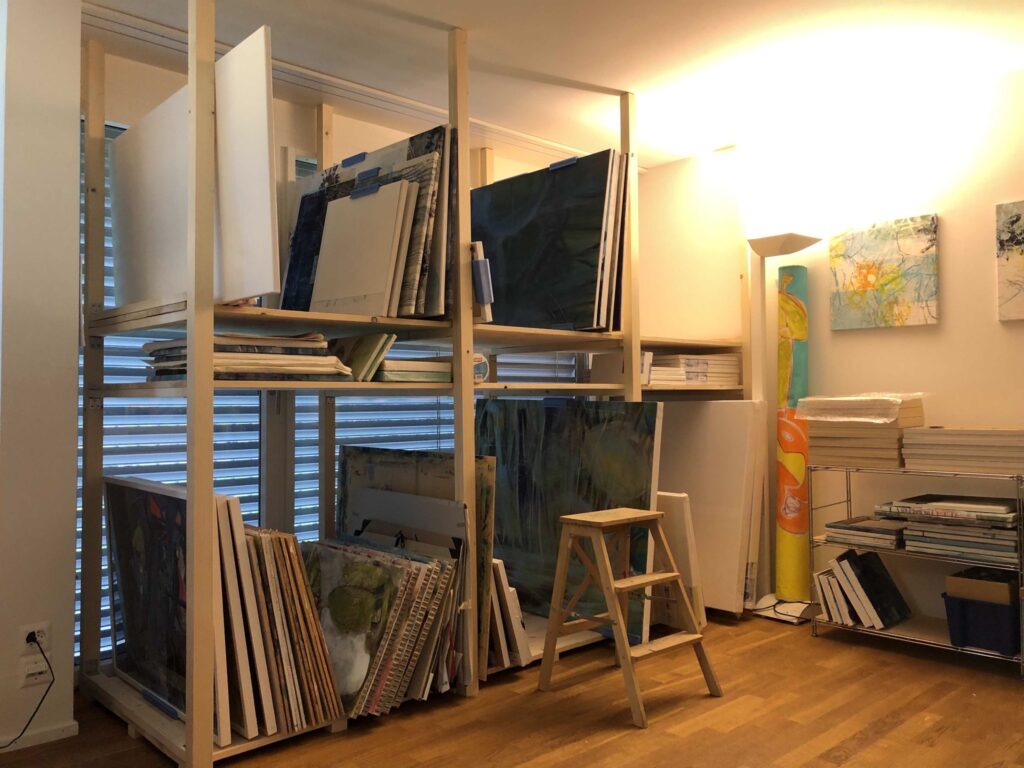 Ein Regal ist natürlich die naheliegenste Antwort. Aber jedes Atelier, jeder Raum, hat seine eigenen Verhältnisse, jede Künstlerin ihre eigene Ideen. Die einen malen kleine, die anderen grosse Formate.