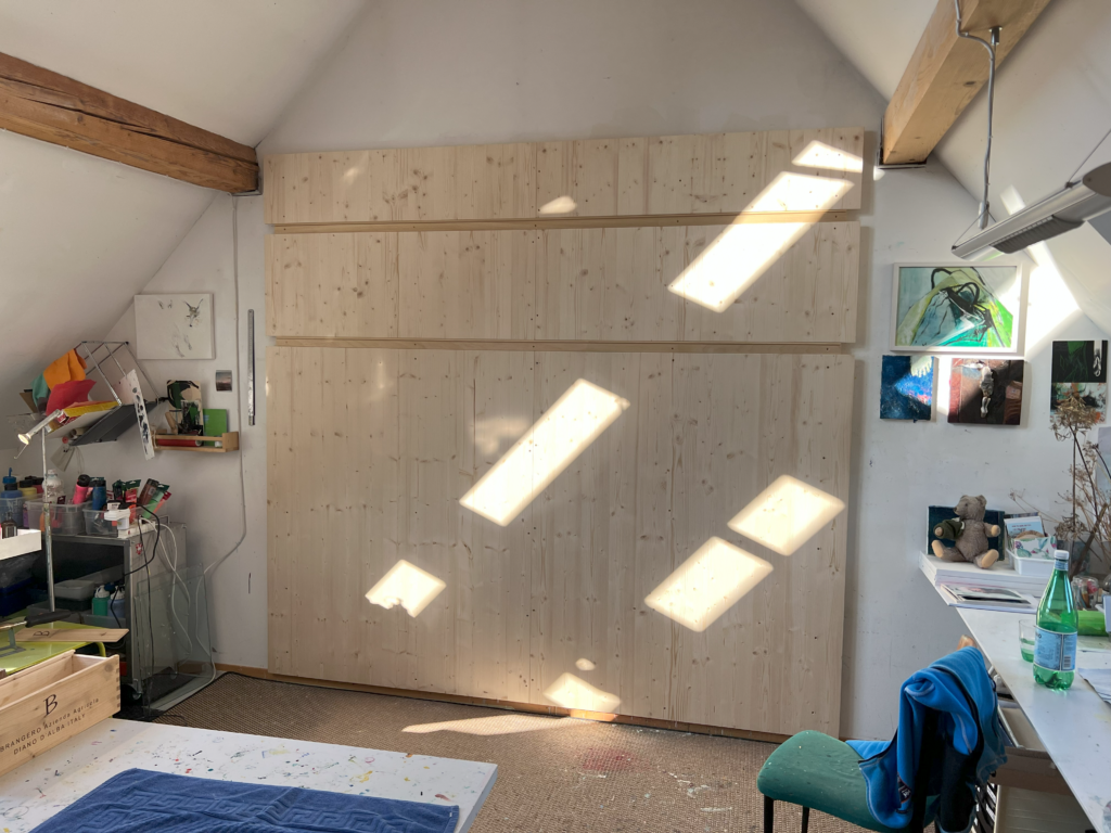 Ein besonders schönes Projekt war die Malwand von Erika Jaun. Erika hat bis zu diesem Zeitpunkt ihre Bilder, an denen sie gearbeitet hat, einfach an ihrer Atelierwand „genagelt“. Mit der Zeit gab es halt immer mehr Löcher, die Wand ist verkleckst und so weiter.